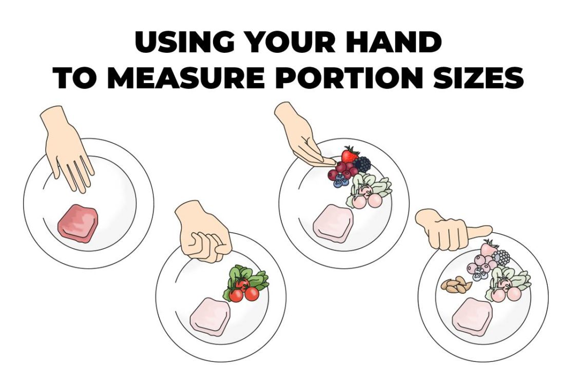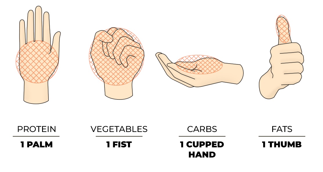 Je hoeft het voedsel niet te wegen om de juiste hoeveelheid te weten. Het enige dat je hoeft te doen om je portie te meten, is je hand gebruiken in plaats van een weegschaal.