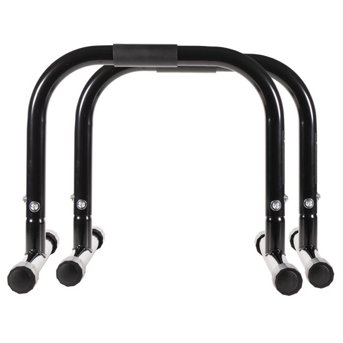 DIP I Parallette Bars is een praktisch hulpmiddel dat elke professionele fitnessenthousiast in huis zou moeten hebben. Ze zijn vooral perfect voor thuis krachttraining en oefeningen zoals push-ups, dips, gymnastische elementen en vele andere oefeningen voor het bovenlichaam en de core. De constructie is sterk en stabiel, dus hij is bestand tegen zware gewichten. Het greepgedeelte heeft een diameter van 38 mm en is gemaakt van niet-slip materiaal om te zorgen voor een stevige grip. De totale lengte van de parallelle stang is 48 cm en de buis bevindt zich op 43 cm hoogte.